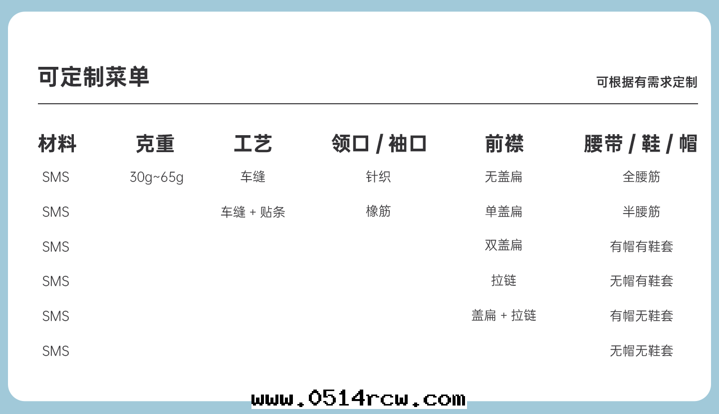 規格尺(chǐ)寸(cùn):S~4XL 主(zhǔ)要(yào)成(chéng)分(fēn):聚丙烯+透气(qì)膜 克(kè)重(zhòng):50g-65g 工藝:車縫、拉鍊(liàn)双(shuāng)蓋扁貼条(tiáo)、有(yǒu)帽(mào)有(yǒu)鞋(xié)套(tào) 包(bāo)装:1件/包(bāo) 25包(bāo)/箱(xiāng)