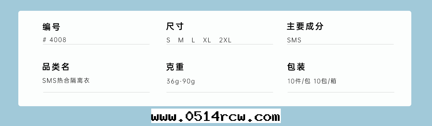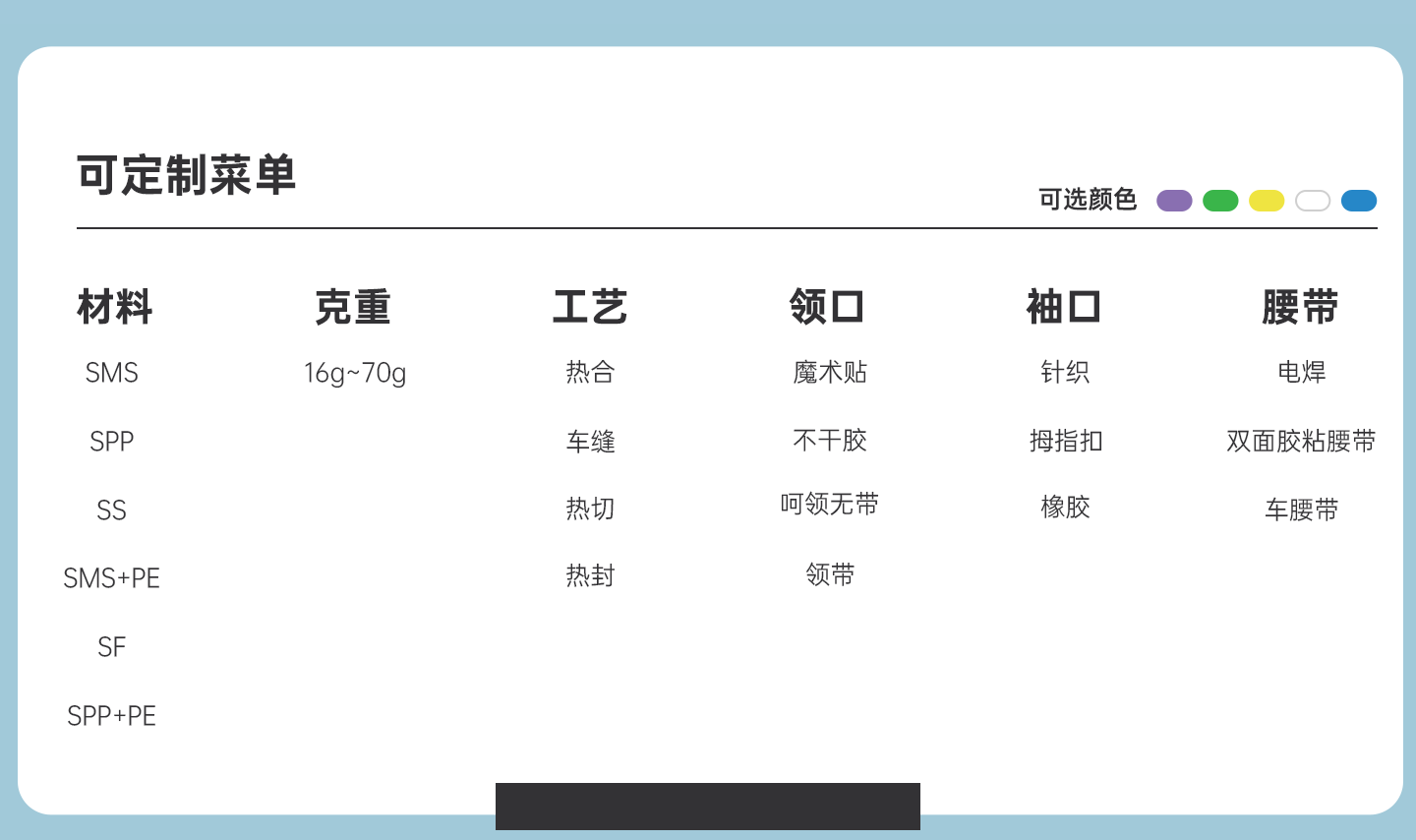 規格尺(chǐ)寸(cùn):S~2XL 主(zhǔ)要(yào)成(chéng)分(fēn):聚丙烯 克(kè)重(zhòng):36g-90g 颜色(sè):白(bái)色(sè)、黃色(sè)、藍(lán)色(sè) 工藝:热(rè)合、針(zhēn)织袖口(kǒu)領口(kǒu)魔術(shù)貼、點(diǎn)焊腰带(dài) 包(bāo)装:10件/包(bāo) 10包(bāo)/箱(xiāng)