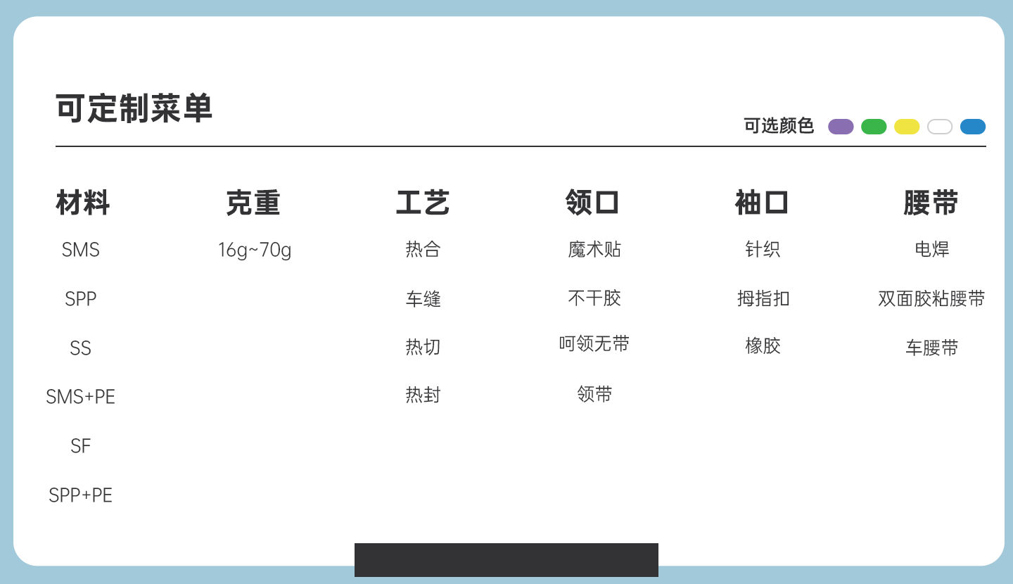 規格尺(chǐ)寸(cùn):S~2XL 主(zhǔ)要(yào)成(chéng)分(fēn):聚乙烯 克(kè)重(zhòng):20g-90g 颜色(sè):白(bái)色(sè)、黃色(sè)、藍(lán)色(sè) 工藝:热(rè)合、拇指扣(kòu)袖口(kǒu)套(tào)头(tóu)式、無後(hòu)背、自(zì)身(shēn)腰带(dài) 包(bāo)装:10件/包(bāo) 10包(bāo)/箱(xiāng)