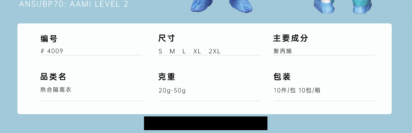 規格尺(chǐ)寸(cùn):S~2XL 主(zhǔ)要(yào)成(chéng)分(fēn):聚丙烯 克(kè)重(zhòng):20g-50g 颜色(sè):白(bái)色(sè)、黃色(sè)、藍(lán)色(sè) 工藝:热(rè)合、拇指扣(kòu)袖口(kǒu)、套(tào)头(tóu)式、無後(hòu)背 包(bāo)装:10件/包(bāo) 10包(bāo)/箱(xiāng)