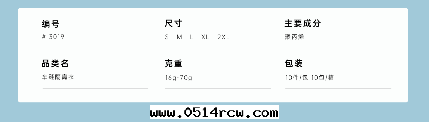 規格尺(chǐ)寸(cùn):S~2XL 主(zhǔ)要(yào)成(chéng)分(fēn):聚丙烯 克(kè)重(zhòng):16g-70g 颜色(sè):白(bái)色(sè)、黃色(sè)、藍(lán)色(sè) 工藝:車縫、橡筋袖口(kǒu)領口(kǒu)領带(dài)、呵腰带(dài) 包(bāo)装:10件/包(bāo) 10包(bāo)/箱(xiāng)