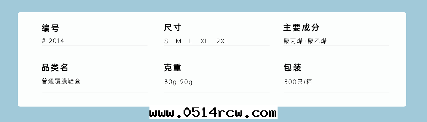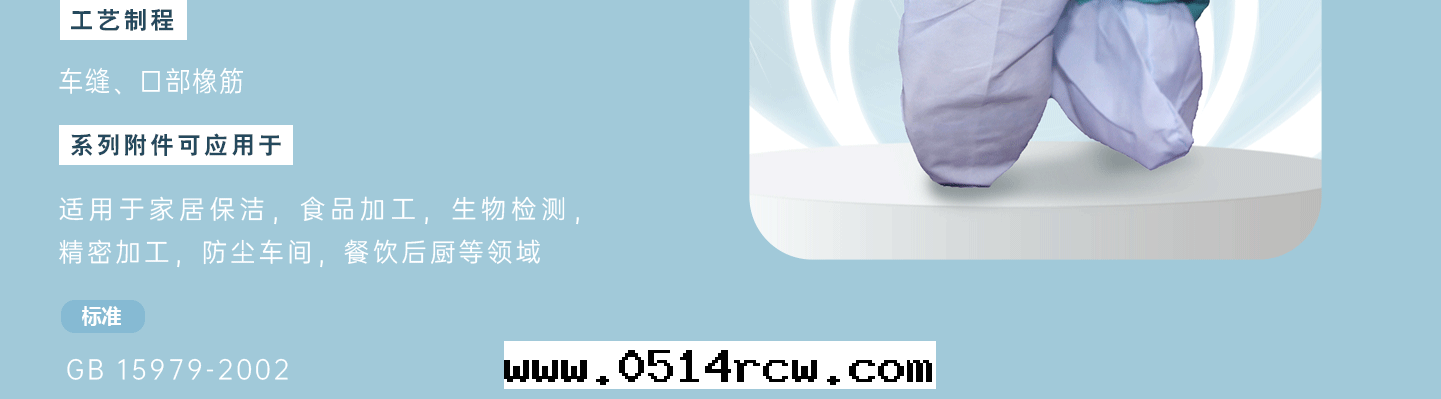 規格尺(chǐ)寸(cùn):S~2XL 主(zhǔ)要(yào)成(chéng)分(fēn):聚丙烯+聚乙烯 克(kè)重(zhòng):30g-90g 颜色(sè):白(bái)色(sè)、藍(lán)色(sè)、深藍(lán)、淺藍(lán)、紫色(sè) 工藝:車縫、口(kǒu)部(bù)橡筋 包(bāo)装:300只(zhī)/箱(xiāng)